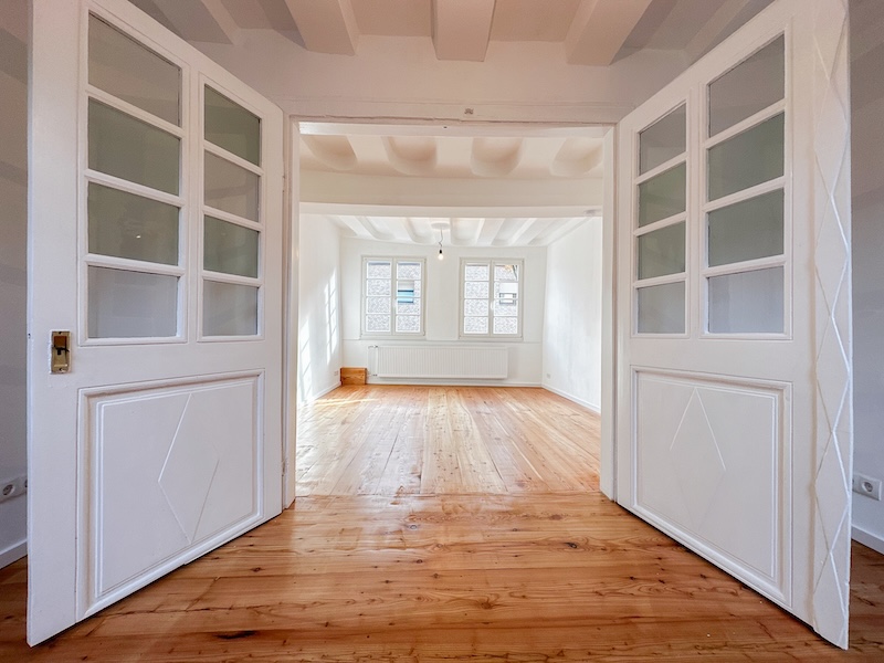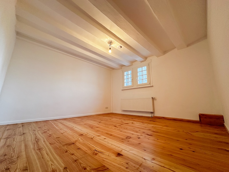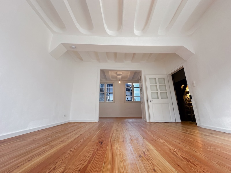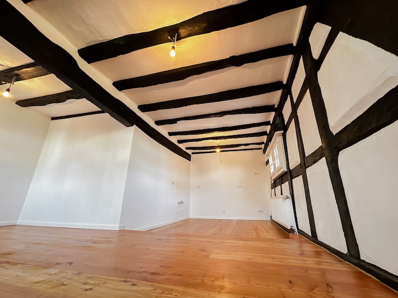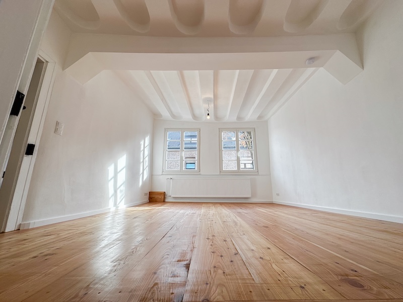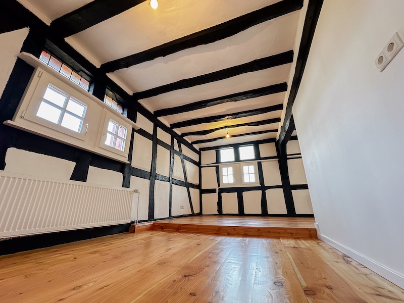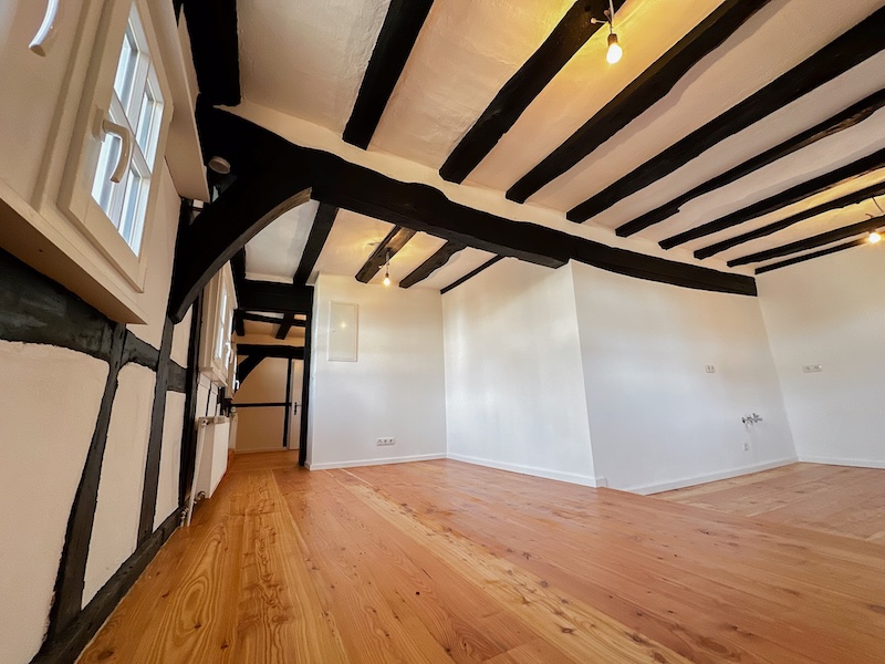 Die großzügigen Räume sind lichtdurchflutet und klar strukturiert. Helle Wandflächen setzen einen bewussten Kontrast zum dunklen Fachwerk und lassen die historische Architektur wirkungsvoll zur Geltung kommen. Die Raumaufteilung bietet vielfältige Nutzungsmöglichkeiten, sei es als großzügiges Familienhaus, stilvolles Domizil für Paare oder als Wohnen mit integrierter Homeoffice-Nutzung.