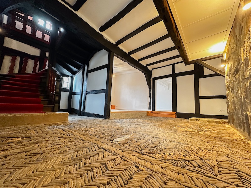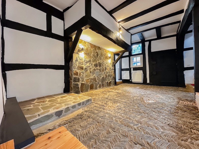 Bereits beim Betreten des Hauses wird die besondere Atmosphäre spürbar. Freigelegtes, original erhaltenes Fachwerk, massive Bundbalken, sichtbare historische Konstruktionen sowie aufwendig aufgearbeitete Massivholzböden prägen das Erscheinungsbild. Der Natursteinboden im Eingangsbereich unterstreicht den authentischen Charakter des Gebäudes und verleiht ihm eine eindrucksvolle Präsenz.